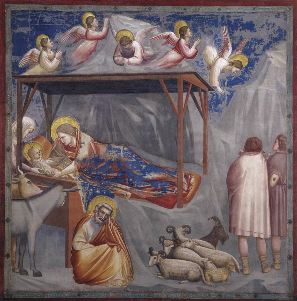 W tej samej bazylice mamy – także autorstwa Giotta – fresk z cyklu Życie Jezusa przedstawiający już taką scenę, do jakiej jesteśmy przyzwyczajeni: jest stajenka, dwaj pasterze, anioły na dachu skromnej budowli, zwierzęta – wół, osioł, owce i kozy. Maria leży na dość niewygodnym jak się wydaje łożu, obok stoi żłóbek przypominający paśnik, z którego kobieta – położna (opowiadają o niej niektóre apokryfy) wyjmuje Dzieciątko i podaje je matce. Jezus tutaj też jest owinięty bandażami, jak mumia. A tyłem do tego całego harmideru siedzi stary i zabiedzony Józef, wyglądający tak, jakby to on był w połogu… Świetna scena! Podobnie ujmuje to pochodzący z XIV wieku fresk w kaplicy w Greccio – a więc tam, gdzie pokazano pierwszą szopkę.