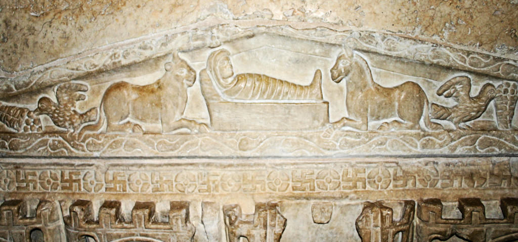 Najstarsze znane nam wizualne przedstawienie tej sceny pochodzi z rzymskiego sarkofagu z IV w. Dzieciątko (przedstawione co prawda jakby było małą mumią) leży nie w żłobie, tylko na rzymskim łożu z oparciem, a towarzyszą mu zwierzęta: koń, lew (jeśli się nie mylę) oraz kompletnie nie zainteresowane Nim ptaki. Motywem dekoracyjnym fryzu są kwiaty i… swastyki.