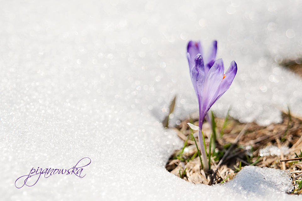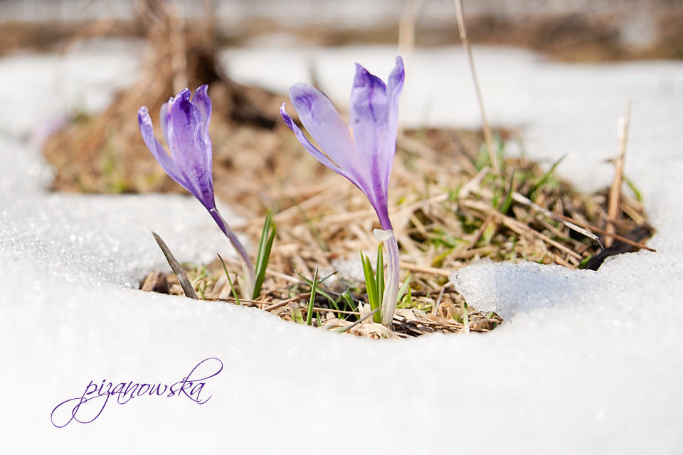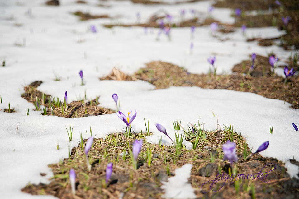 Dolina Lejowa jeszcze słabo fioletowa, ale łebki krokusów już wychodzą ze śniegu. Jeszcze tydzień a polana obrodzi w kwiaty i turystów namiętnie deptających te rośliny w celach fotograficznych. O ukwieconych polanach w Dolinie Chochołowskiej możemy jeszcze pomarzyć. Ostatnie opady śniegu spowodowały, że zalega go tam jeszcze conajmniej metr. Dopiero gdzieś za około 2 tygodnie będzie można pomyśleć o botaniczno – fotograficznym wypadzie do tejże dolinki. Pamiętajcie jednak, że krokusy są pod ochroną. Nie zrywamy, nie depczemy!!!